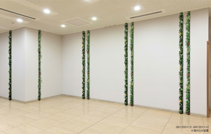 スリムなラインBOXタイプ、フレームは2色。縦や横にアクセントラインとして、壁や支柱に取り付けたり、埋め込んだり、グリーンが正面に見える装飾ができます。